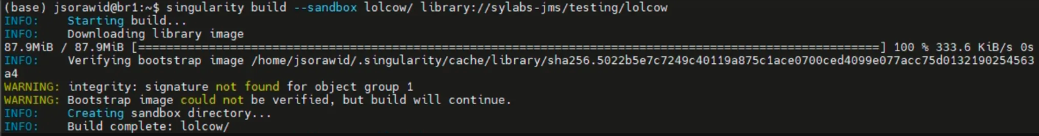 $ sudo singularity build --sandbox lolcow/ library://sylabs-jms/testing/lolcow