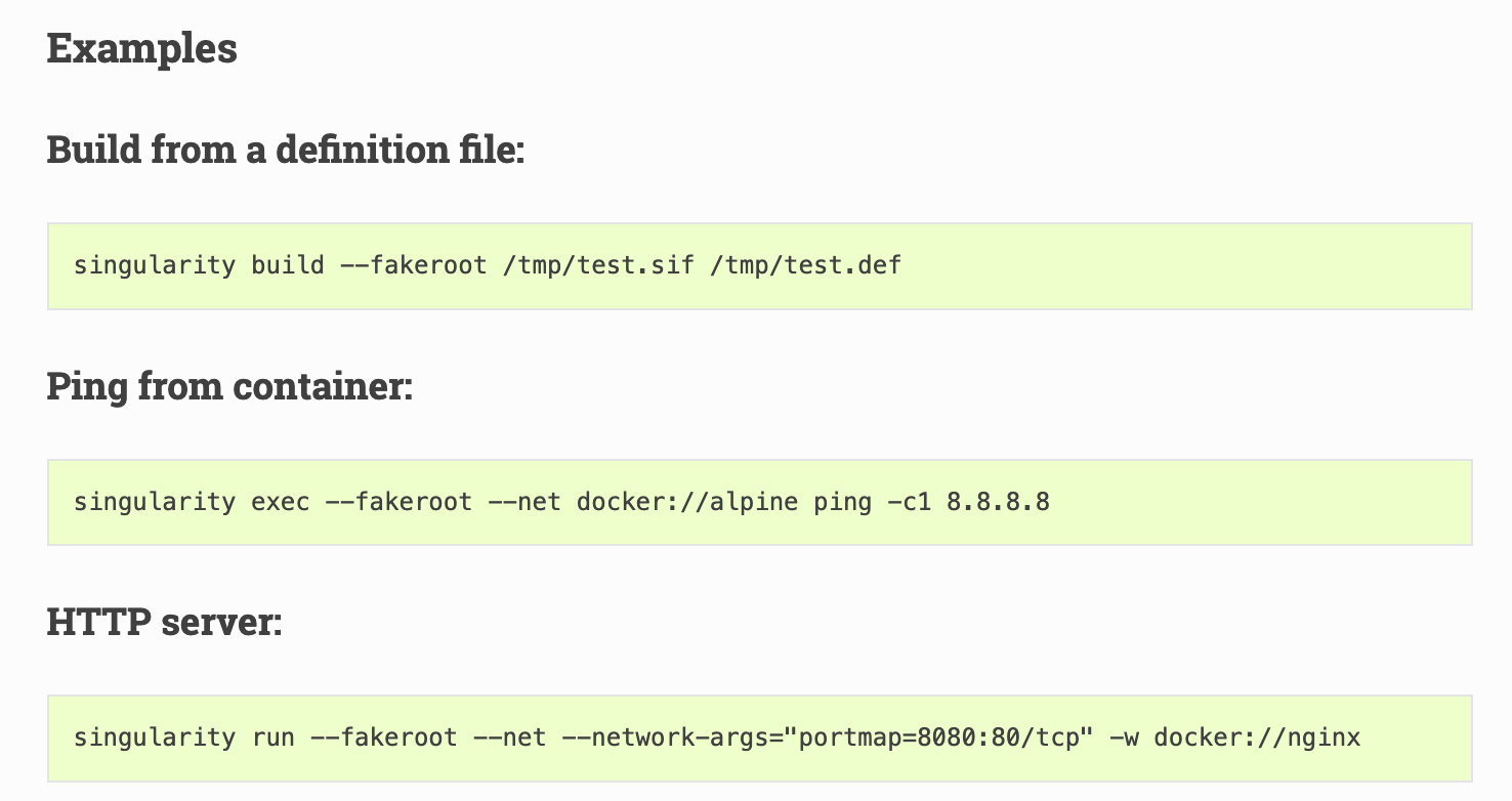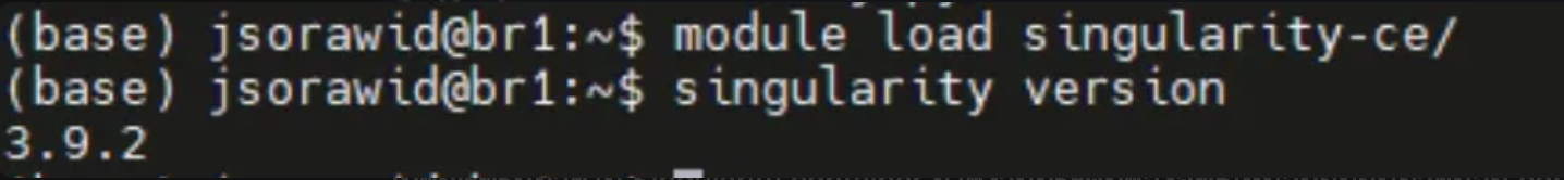 ในขณะที่รันภายใน Singularity container ผู้ใช้งานมีระดับของสิทธิ์เหมือนกันกับภายนอก container โดยทั่วไปแล้ว Singularity image จะต้องถูกพัฒนาและสร้างขึ้นมาจากพื้นฐานเครื่อง Linux ซึ่งต้องมีสิทธิ์เทียบเท่า Administrator โดยในระบบ หรือใช้งาน Feature Fakeroot โดยตัวอย่างไฟล์ Singularity image กลาง สำหรับผู้ใช้งานทุกคนถูกวางไว้ที่ /cm/shared/sif/