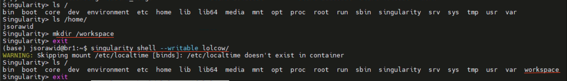 Directory ที่ได้จะทำงานเหมือนกับ Container ในไฟล์ SIF ทุกประการ หากต้องการแก้ไขสิ่งต่าง ๆ ภายใน Container ให้ใช้ flag --writable ขณะเรียกใช้งาน Container การทำสิ่งนี้ในฐานะ root เป็นแนวทางที่ดี เพื่อให้มั่นใจว่าคุณมีสิทธิ์ในการเข้าถึง file และ directory ที่ต้องการเปลี่ยนแปลง