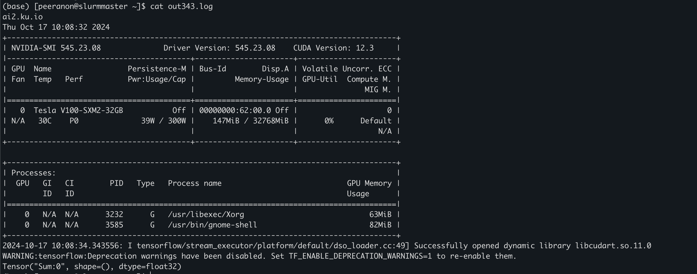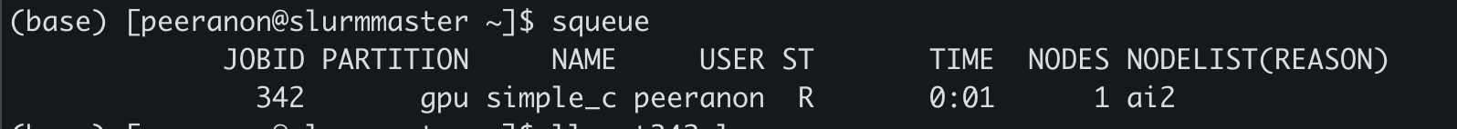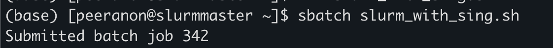 When the job finishes running, you will find an output file with the default name format:out<JOBID>.log where <JOBID> is the job number assigned when you submitted the job with sbatch. For example, out343.log. Opening this file will show the output log from the job you just ran.